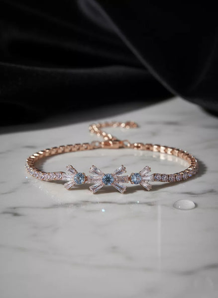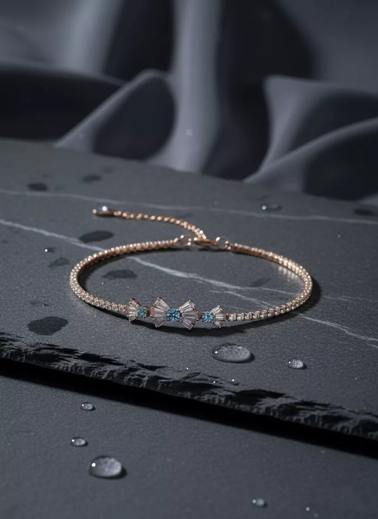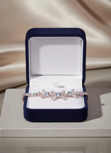 Grace meets glamour in this Crystal Bow Elegance Bracelet, designed to illuminate your wrist with refined beauty. This exquisite piece features a row of sparkling cubic stones with three radiant bow-shaped motifs accented by aqua blue crystals, creating a look that’s both chic and timeless.