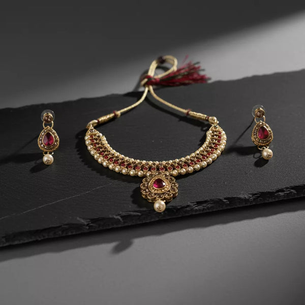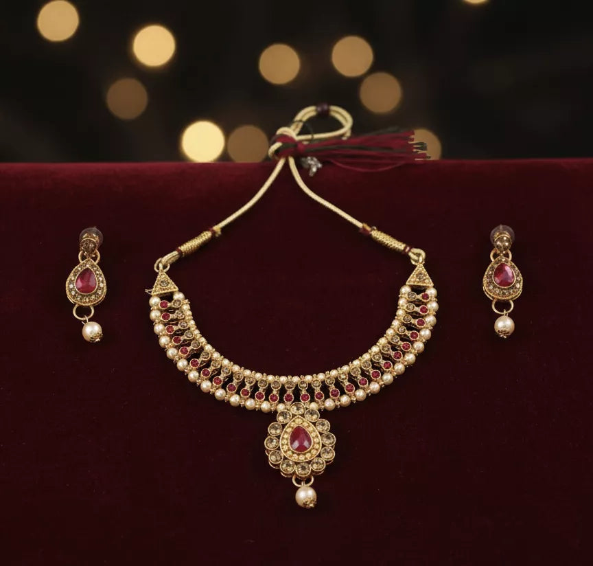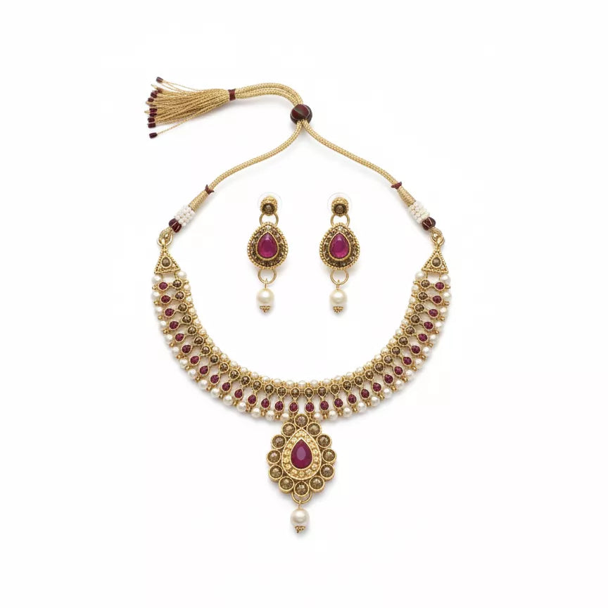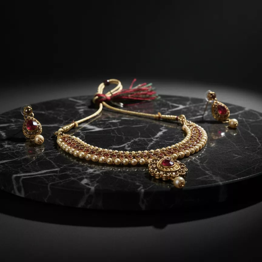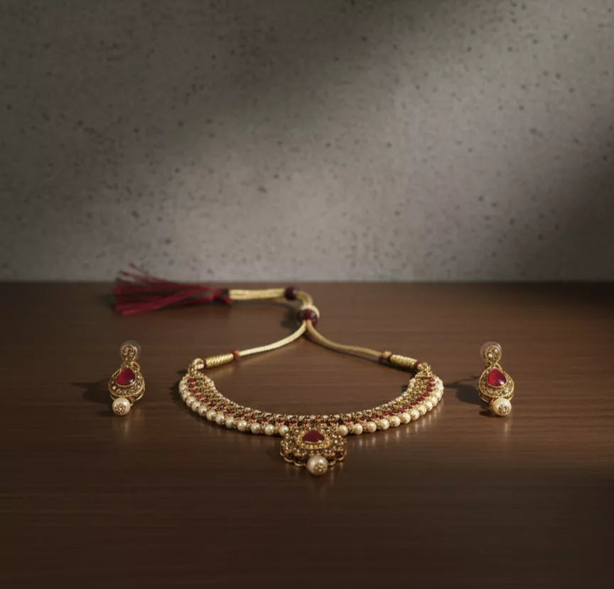 Inspired by regal Indian artistry, this handcrafted set features a luxurious combination of ruby-red stones, delicate pearls, and gold-tone detailing, making it a statement piece for every special occasion.