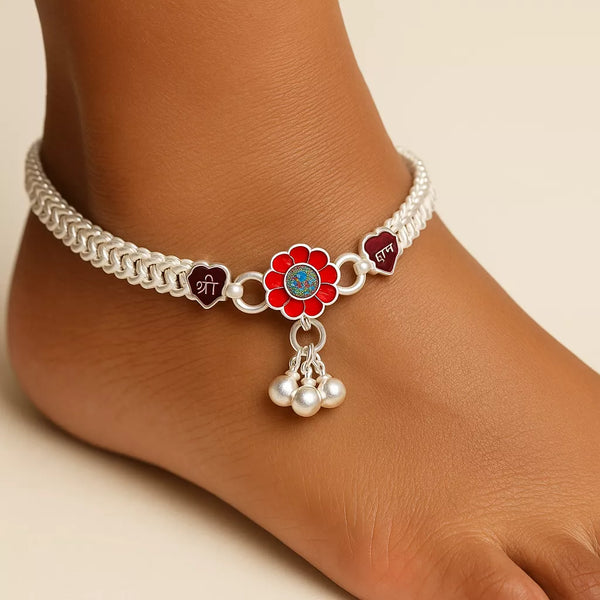 Elevate your traditional charm with this Divine Bloom Silver Anklet, a stunning fusion of culture, spirituality, and modern elegance. Crafted with premium-quality silver-tone metal, this anklet features a bold red enamel flower centerpiece symbolizing beauty and grace, flanked by two heart-shaped charms engraved with the sacred words “श्री” and “धारा.”