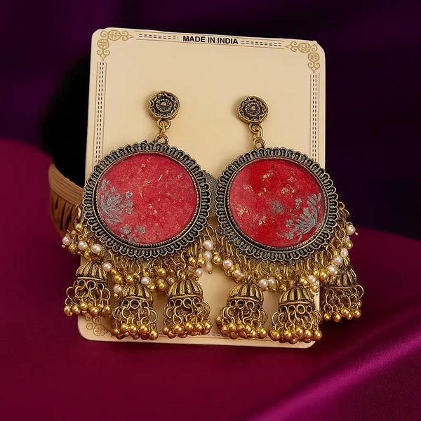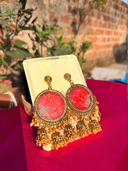 Encased in an antique gold frame and finished with elegant pearl and golden bead jhumka drops, these earrings are a perfect fusion of traditional charm and modern resin artistry. Every pair is lovingly made by hand — making it truly unique, just like you.