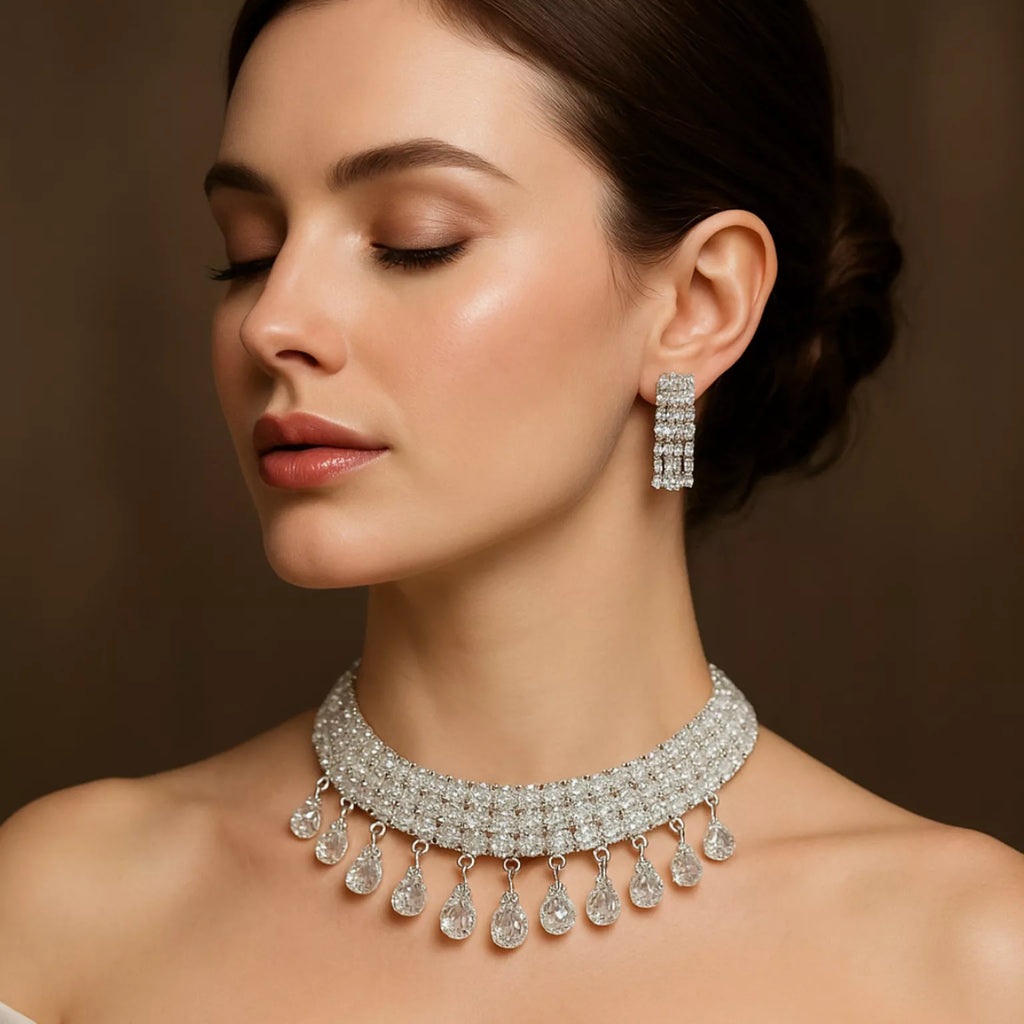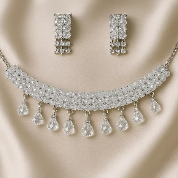 The necklace features rows of transparent faceted beads with fine silver accents, creating a luxurious shimmer with every movement. Delicate dangling teardrop crystals at the edge add a graceful finish, while the earrings echo the same elegant design with layered crystal clusters and tiny rhinestones for a coordinated, glamorous look.