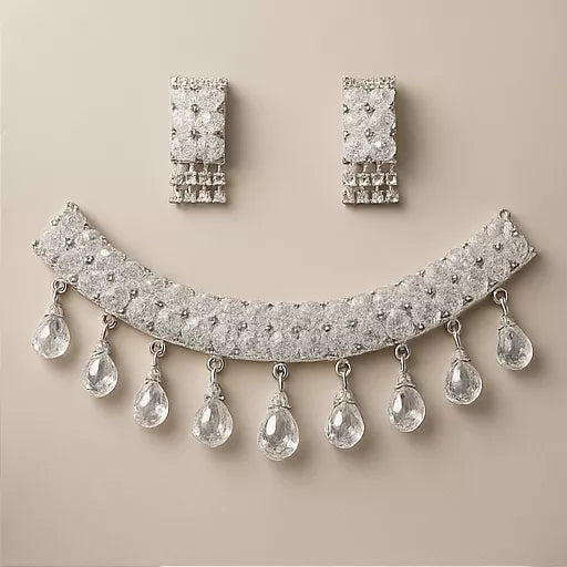 Add a touch of elegance and sparkle to your look with this Silver Crystal Bead Choker Necklace Set, beautifully crafted for women who love timeless sophistication. This exquisite jewelry set includes a multi-layered crystal bead choker necklace paired with matching rectangular drop earrings, designed to complement both traditional and modern outfits.