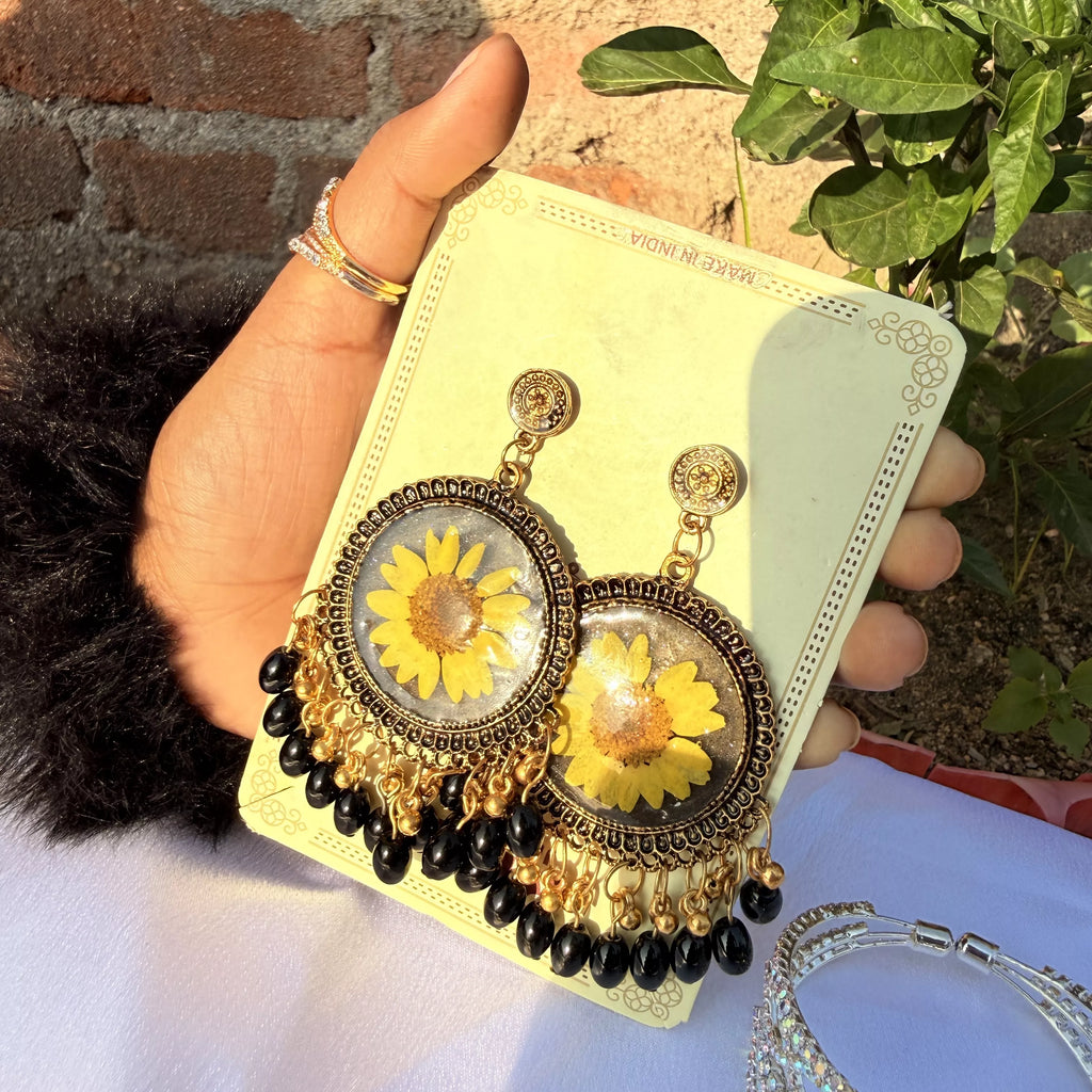 These handcrafted resin-art jhumka earrings feature real pressed sunflower petals premium black preserved beautifully inside a crystal-clear resin dome — capturing the warmth, joy, and brilliance of nature itself.