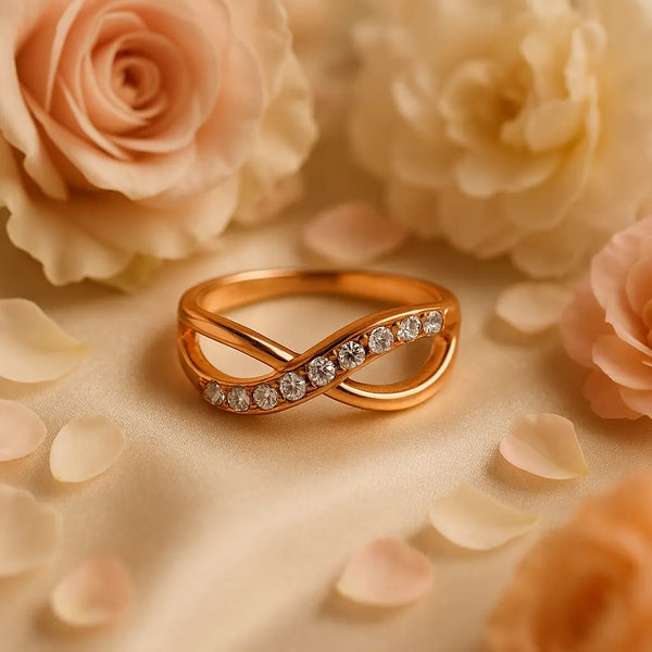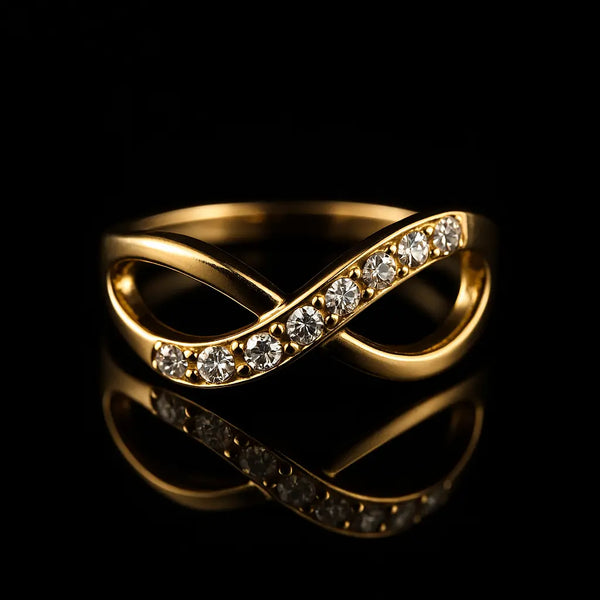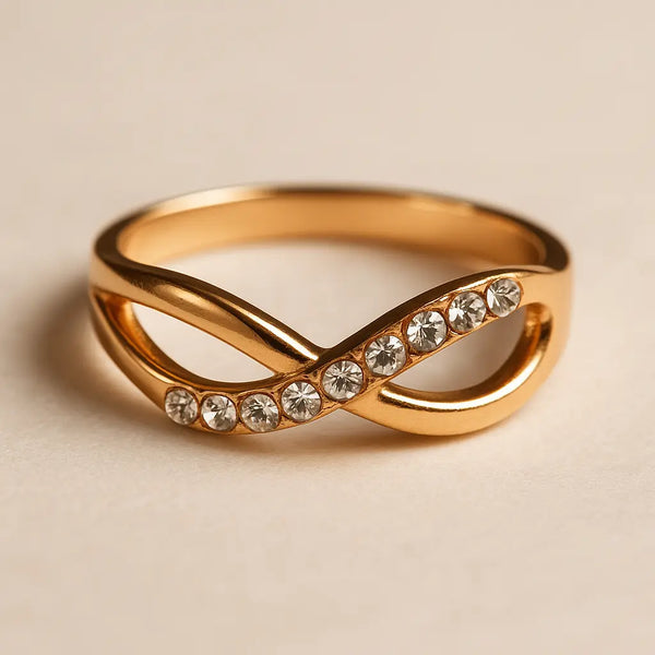 Celebrate timeless beauty and everlasting love with this Elegant Gold Infinity Crossover Ring — a stunning blend of sophistication and sentiment. Designed in a graceful infinity silhouette, this ring features two intertwining bands: one with a smooth, polished gold finish, and the other set with seven sparkling round-cut white stones, symbolizing eternal connection and endless shine.