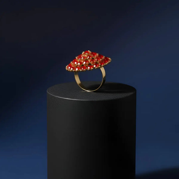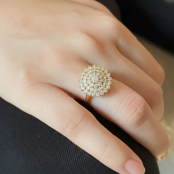 This ring features a beautiful dome-shaped cluster of sparkling stones, carefully set on a sleek gold-toned band, giving it a luxurious look without the heavy price tag. Whether you’re heading to a party, a festive function, a wedding, or just want to upgrade your daily style, this ring makes sure you shine wherever you go.
