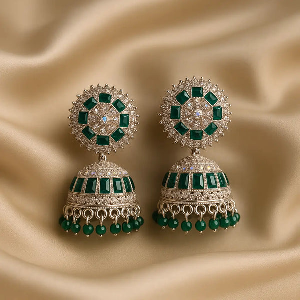 Step into the world of timeless grace with the Emerald Aura Royal Dome Jhumka, a masterpiece that celebrates the grandeur of Indian heritage with a modern royal touch.