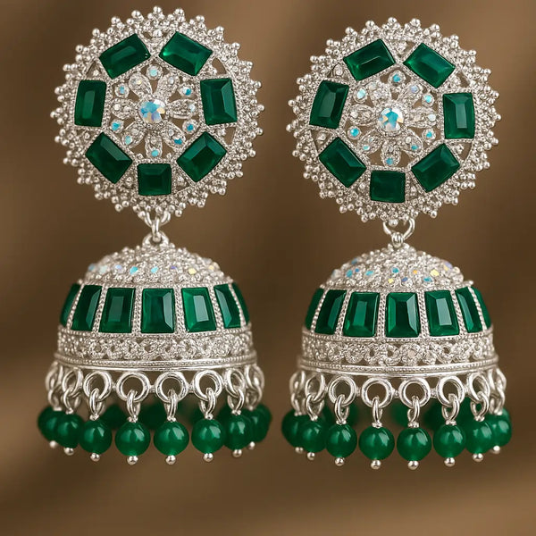Exquisitely handcrafted in oxidized silver, each earring features a floral stud top adorned with sparkling crystal stones and emerald-green rectangular gemstones that radiate opulence. The dome-shaped jhumka is intricately embellished with fine silver filigree detailing, echoing the elegance of palace craftsmanship. A delicate fringe of green beads sways gracefully with every movement, adding rhythm and charm to your look.