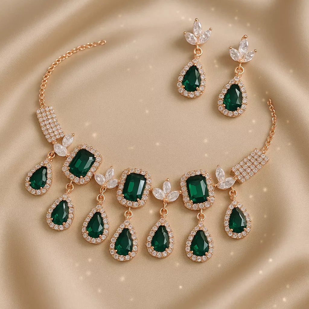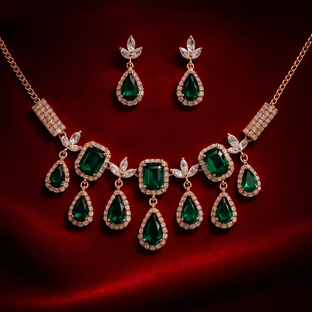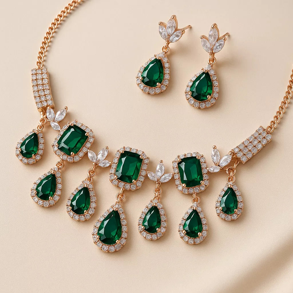 Crafted with precision, this stunning jewelry set features emerald-green stones framed by sparkling crystal accents, creating a radiant glow that enhances every outfit — from festive sarees to elegant evening gowns.